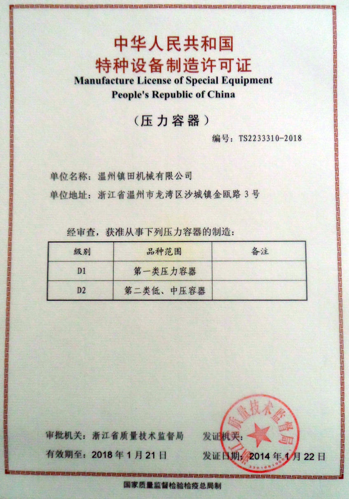 Wenzhou Jhenten Machinery CO. LTD received the "special equipment manufacturing license (pressure vessel)" issued by Zhejiang province bureau of quality and technical supervision on February 10, 2014, permitted to engage in the following D grade pressure vessel manufacturing. It’s Valid from January 22, 2014 to January 21, 2018. Because of obtain the special equipment manufacturing license, the company's comprehensive strength has increased.
